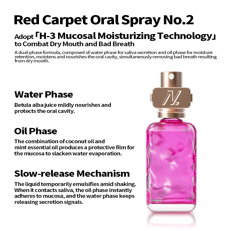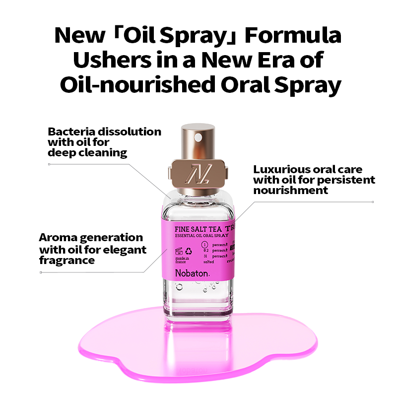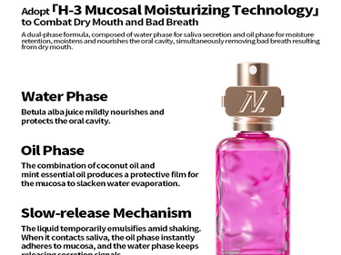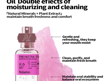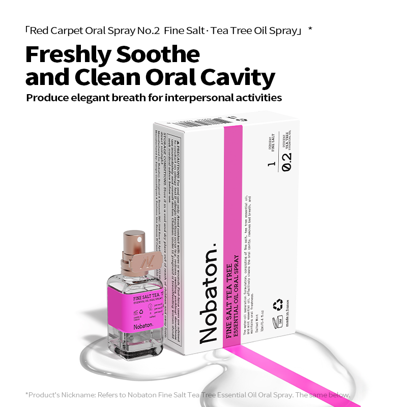1. Brand Background: Founded in the United States in 2017, it was initially available only to people within Hollywood, becoming the private toothpaste brand of Hollywood stars and known as the 'Red Carpet Radiance Toothpaste.' The brand has over 10,000 offline partner stores, is available in major pharmacies in the UK, Hong Kong, and other regions, and has entered high-end domestic retailers such as SKP, citysuper, Watsons, Ole, and blt.2. Product Introduction: 'Inspired by the vocal care of Hollywood opera and Broadway actors, Nobaton Essential Oil Oral Spray was born.' Portable, freshens breath with a single spray; instantly moisturizes and soothes a dry throat, protects the vocal cords; addresses oral odor; relieves oral inflammation and internal heat; refreshes and energizes.3. Core Selling Points (Ingredients): Throat and voice protection / Clears heat / Refreshes and energizes, instantly freshens breath, relieves oral discomfort1. The private toothpaste brand favored by Hollywood stars from the United States, professional oral care highly loved by Hollywood celebrities.2. 'H-3 Mucosal Moisturizing Technology' counteracts dry mouth and bad breath. H-3 technology uses a water-oil biphasic formula to promote saliva production. The water phase promotes secretion, and the oil phase locks in moisture, achieving dual oral hydration, relieving dry mouth and throat, while freshening breath. [Water phase: Birch sap, regulates saliva secretion, gently cares for the mouth. Oil phase: Coconut oil, peppermint essential oil, forms a mucosal protective layer and slows water evaporation.]3. Added natural plant essential oils from France, bringing a new era of oral oil sprays. Plant essential oils are naturally antibacterial and oil-friendly, dissolving bacteria in oil to maintain oral health, while also healing the body and mind and relieving stress.4. Portable, spray anytime before business trips, meetings, or social events to freshen breath. A Hollywood-level social secret, providing luxurious oral care anywhere. Pink Salt Moisturizing Variant (Pink) — Clears heat: promotes saliva secretion, relieves dry mouth and bad breath, reduces internal heat and dryness, repairs oral heat discomfort, and moisturizes the mouth.4. Suggested Use / Cleaning Method: Shake the bottle lightly before use to mix the ingredients evenly. Aim at the mouth and press the spray nozzle 2-3 times. No rinsing required. '*This product cannot replace medication.'